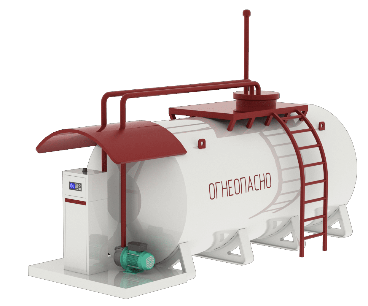 Горизонтальный резервуар для хранения нефтепродуктов с установленным на раме комплектом необходимого оборудования. Сравнительно низкая цена, нет необходимости делать принудительную вентиляцию технического отсека, оперативный и удобный доступ ко всем узлам и агрегатам топливного модуля.