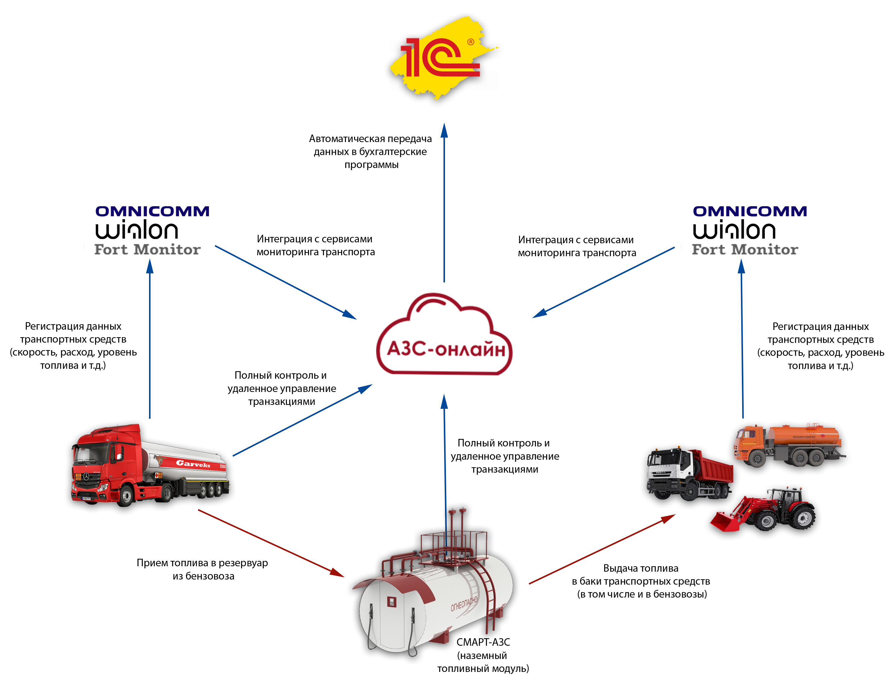 На внутриведомственные АЗС устанавливаются специальные контроллеры и датчики, которые обеспечивают: безоператорную заправку техники через заправочные колонки, автоматическую приемку топлива в резервуары, управляют насосами перекачки топлива и т.д. Все операции производятся в автоматическом режиме без участия оператора АЗС. Устанавливается система автоматического распознания государственных номеров транспортных средств и видеофиксации происходящих событий. Осуществляется автоматическая сверка данных с системами мониторинга автотранспорта и тем самым контролируется сколько топлива было выдано колонкой и сколько попало в бак транспортного средства, то же самое касается и топливозаправщиков, которые привозят топливо на АЗС или забирают его. Все данные о происходящих на АЗС событиях автоматически передаются в специализированное программное обеспечение «АЗС-Онлайн» и бухгалтерскую программу 1С.
